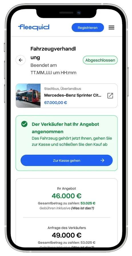 Fleequid wurde entwickelt, um gebrauchte Busse professionell, sicher und ergebnisorientiert zu verkaufen. Von der Veröffentlichung bis zur Zahlung ist jeder Schritt darauf ausgelegt, Ihr Fahrzeug aufzuwerten, und bietet Ihnen zwei ergänzende Wege: die Auktion und den Sofortverkauf mit Sofort-Kaufen.