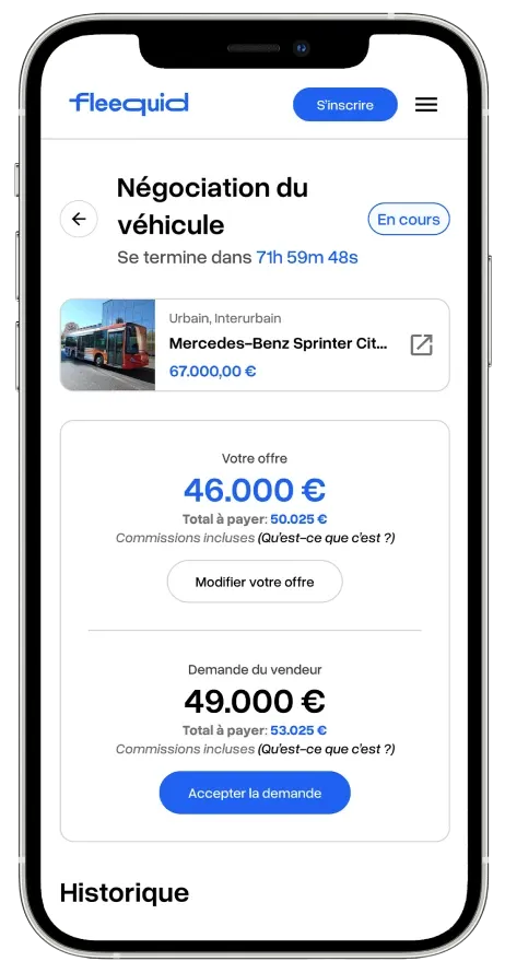 Avec Fleequid, tout le processus de vente est clair et digitalisé. Tous les acheteurs enregistrés sont des professionnels vérifiés, et leurs offres sont engageantes grâce au dépôt de garantie.