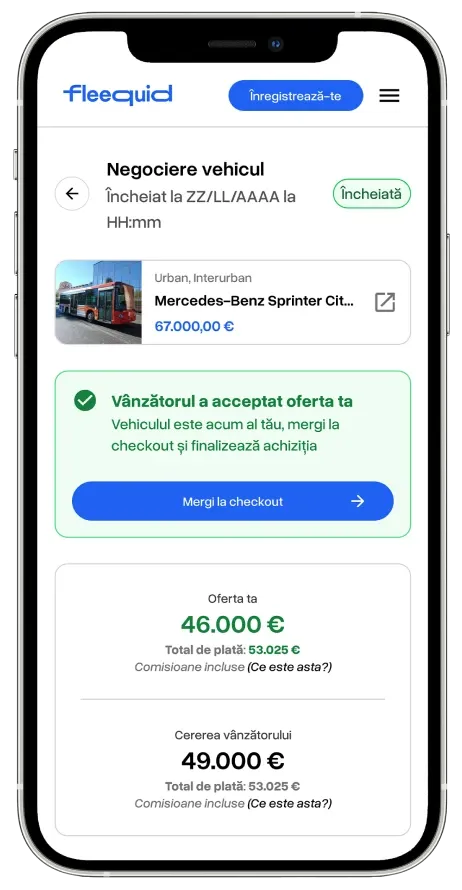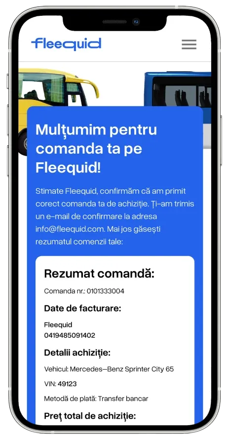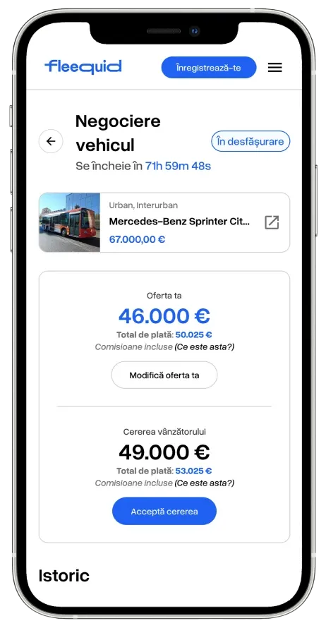 Fleequid este concepută pentru a vinde autobuze second-hand într-un mod profesionist, sigur și orientat către rezultate. De la publicare până la încasare, fiecare etapă este gândită pentru a valorifica vehiculul tău, oferindu-ți două căi complementare: licitația și vânzarea imediată cu Cumpără Acum.